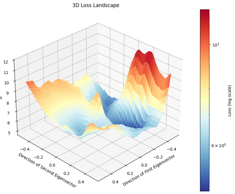 We generate our loss landscapes by calculating the Hessian (via PyHessian) of the loss function and then selecting n eigenvectors to perturb the model’s parameters with. These n eigenvectors correspond directly to the number of dimensions in the landscape and capture directions where the model’s loss changes the most when it’s perturbed. We then move along each eigenvector and calculate the total (or average) loss for each new perturbed model which gives us a scalar value for each point in the landscape.